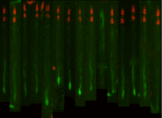 This is a simple example of a DNA damage assay using single cell gel electrophoresis. Here, the measurement of interest is the length and intensity of the comet tail. Also, illumination correction is used to reduce background fluorescence prior to measurement. Also shown is a silver-stained comet example in which the percentage of DNA contained in the tail is calculated.